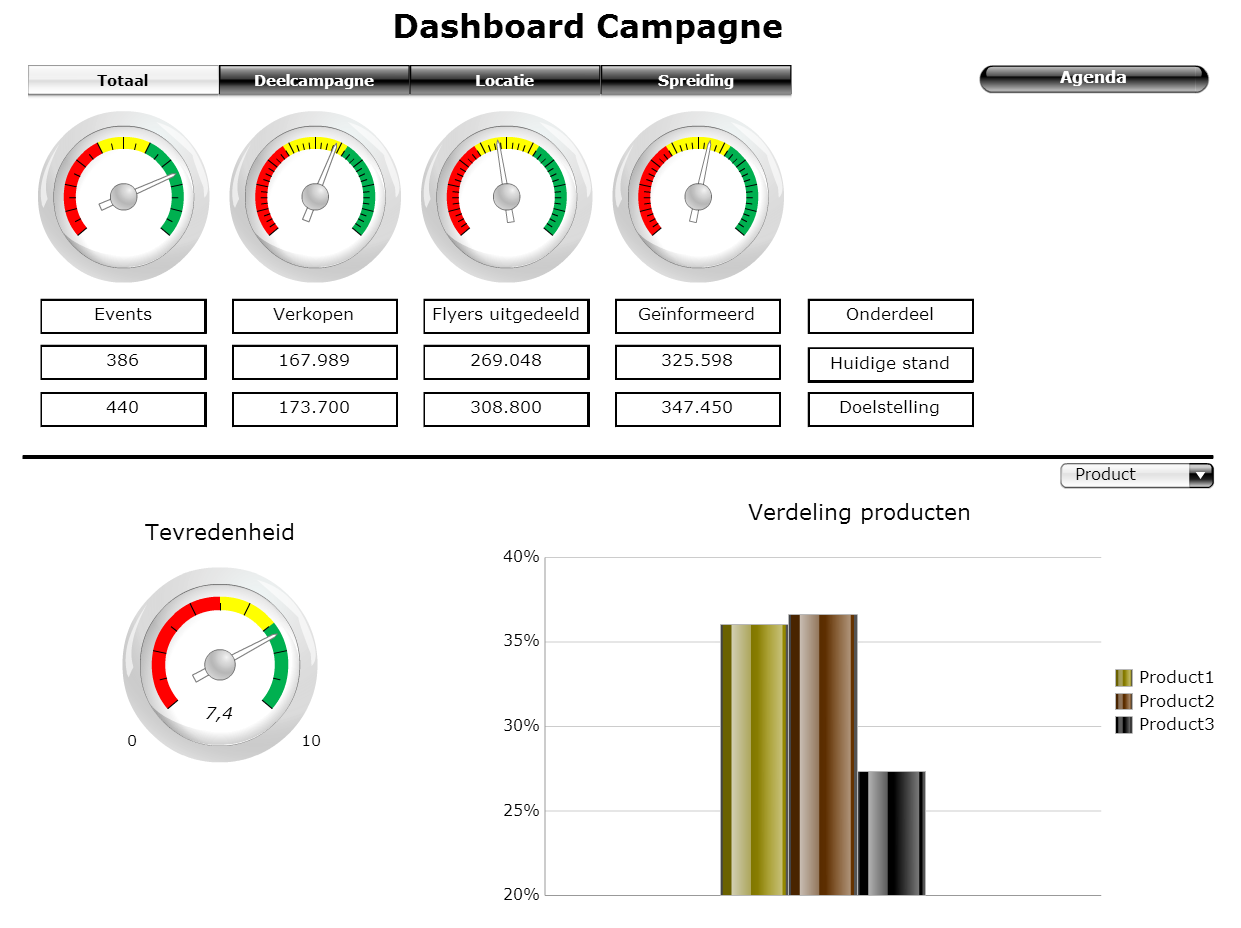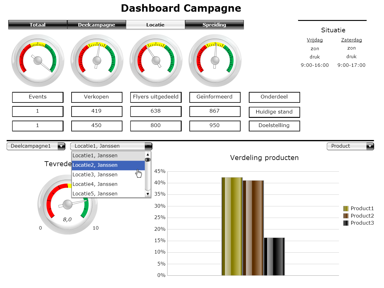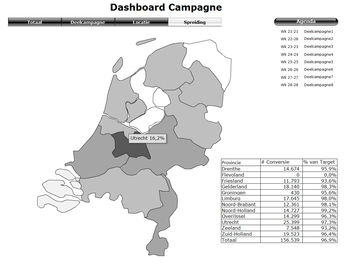 Stel uw bedrijf wil een productlijn lanceren en heeft events (campagnelocaties) in heel het land. Daar delen hele teams op markten, in supermarkten, op beurzen etc. flyers en samples uit en informeren de voorbijkomende klanten. Daarnaast worden er ook producten verkocht. Dashboard Campagne brengt op overallniveau, op deelcampagneniveau en ingezoomd voor elke locatie en periode de conversie in kaart. Daarnaast worden met een interactief landkaartje de cijfers per provincie weergegeven.