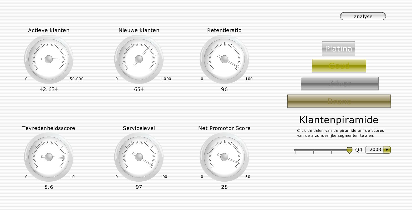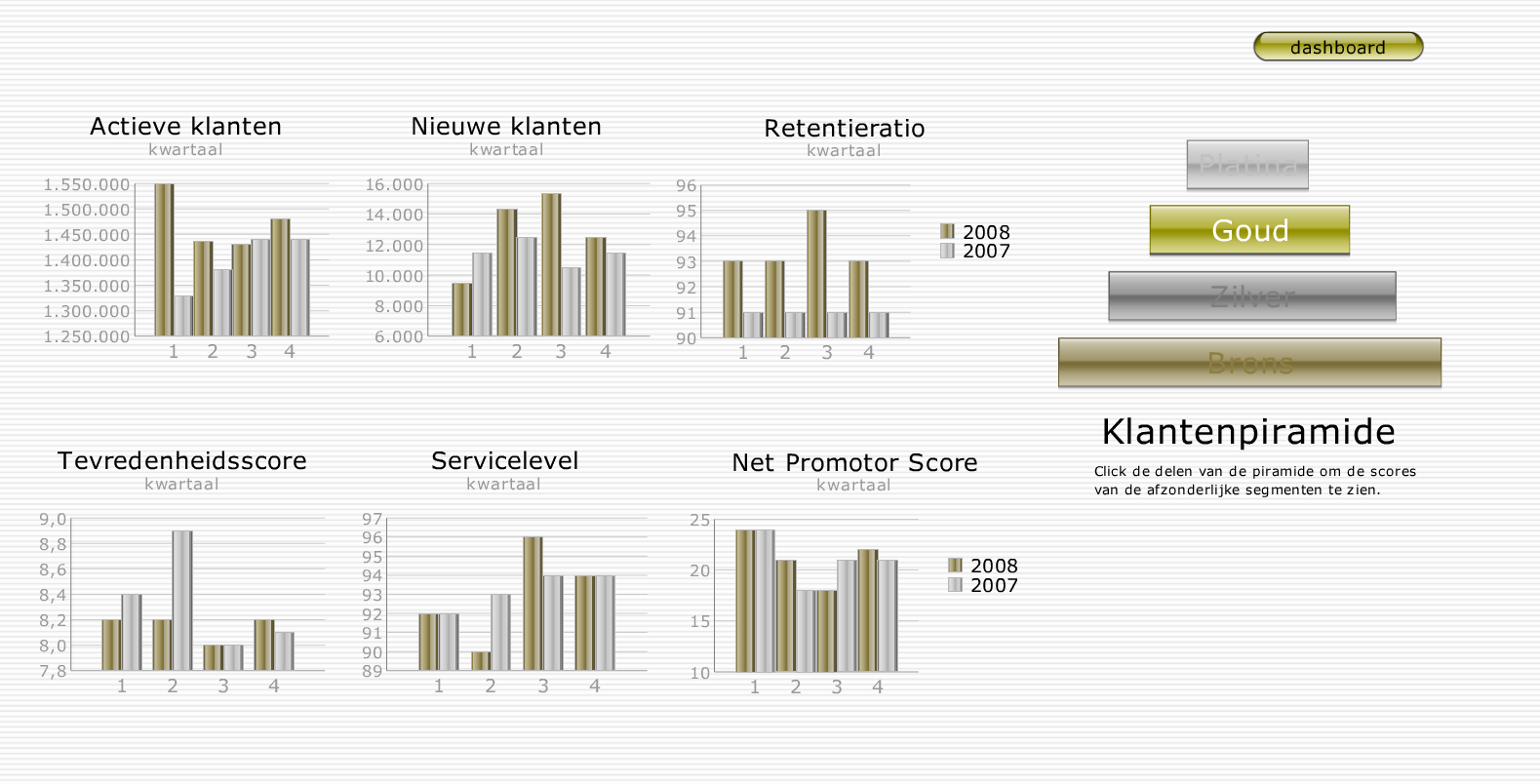 Dashboard Piramide geeft de samenstelling en verloop van de klantendatabase weer op het Goud/Zilver/Brons principe. Deze pagina wordt gevuld middels een excelsheet met een standaard format wat door elk bedrijf in te vullen is. Dit dashboard is gemaakt in SAP Dashboard Design wat end of life is, maar kan prima in Power BI nagemaakt worden.