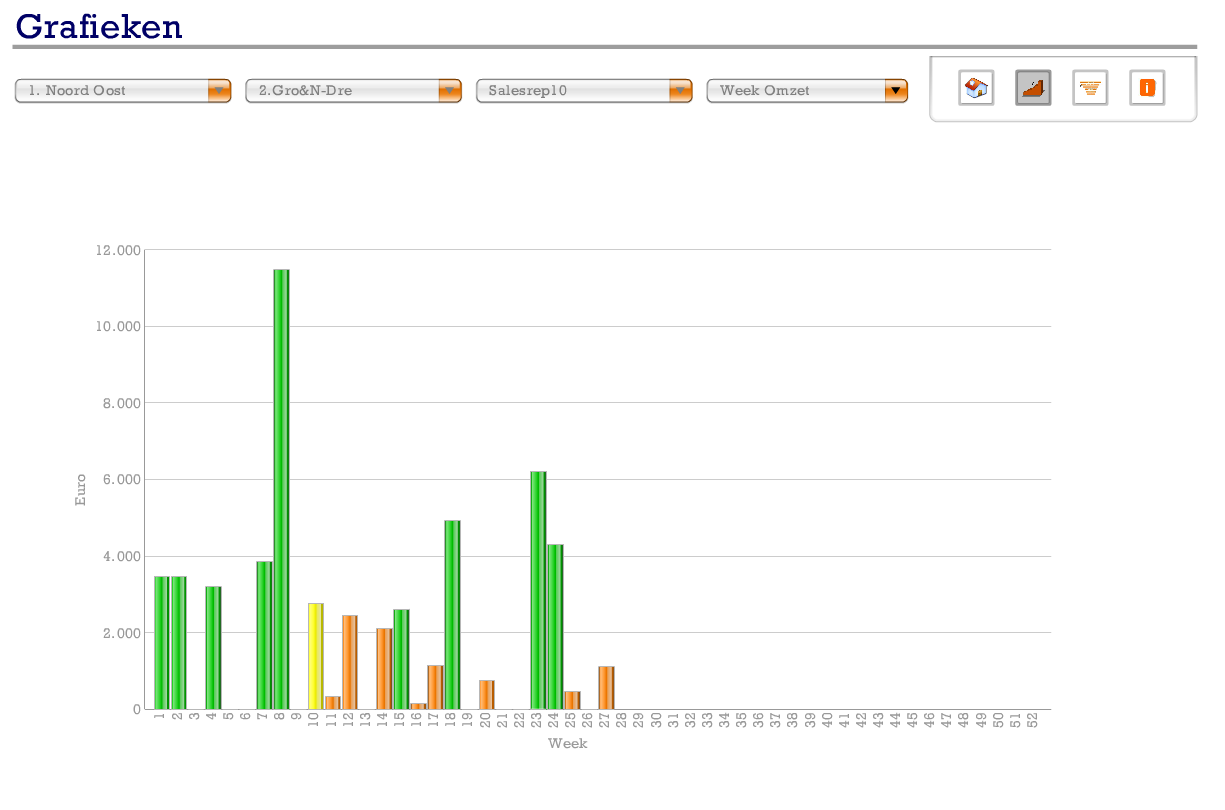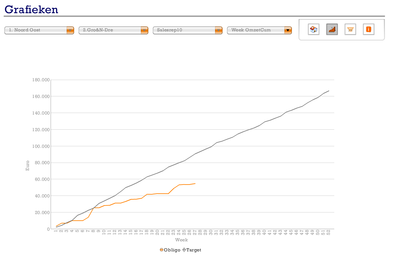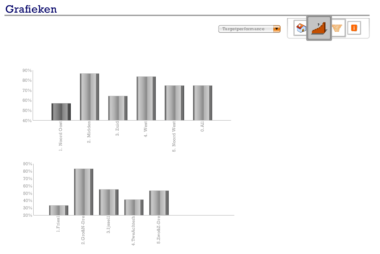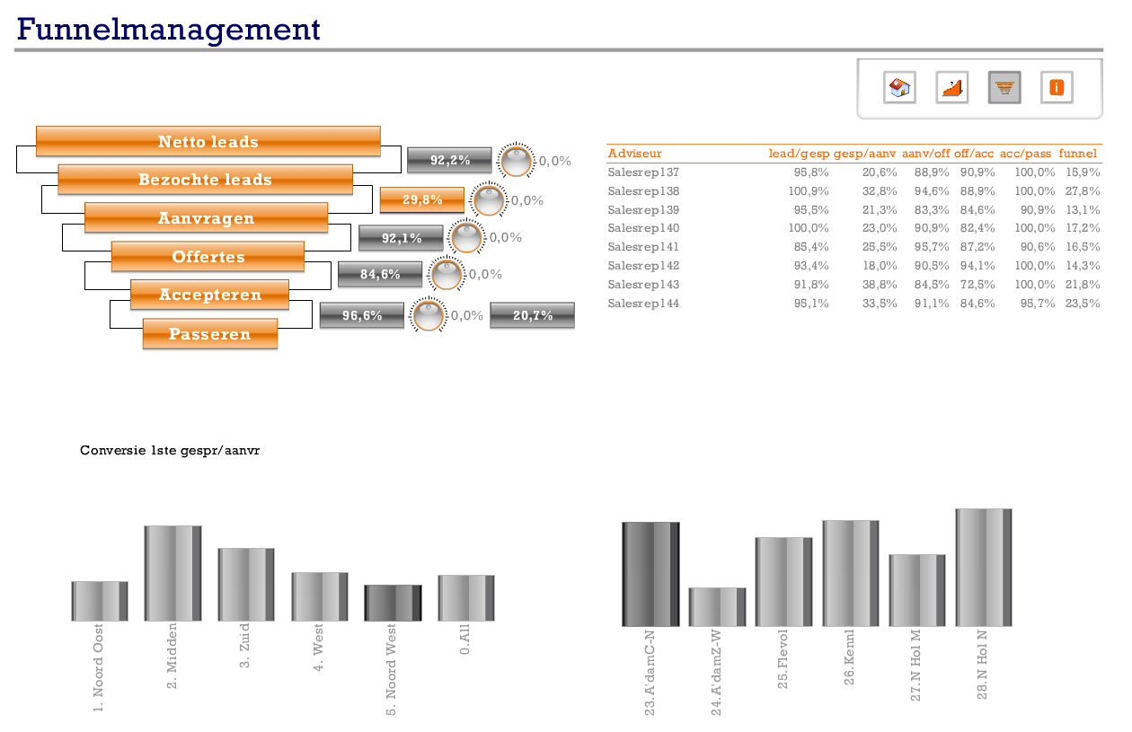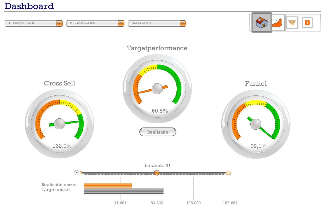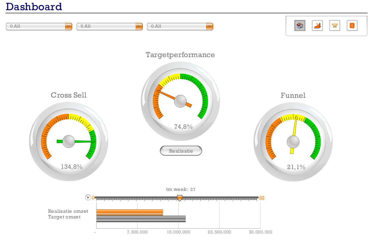 Bijgaand dashboard is geeft de performance van de Salesafdelingen weer. Gedacht moet worden aan bijvoorbeeld het tonen van meters, grafieken en tabellen op hiërarchisch niveau met downdrill mogelijkheden. Een andere pagina geeft een funnel weer en is het mogelijk what if scenario's te simuleren.